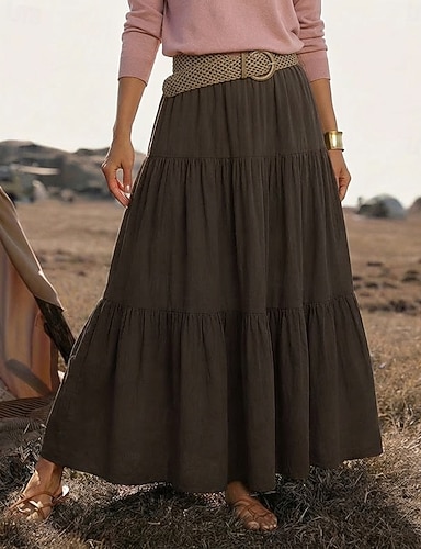 Femmes Jupe en faux coton et lin Mode Occasionnel Maxi Taille Moyenne Jupes Couleur Unie Froncé A Volants Non Elastique Quotidien Vacances Noir Vin Violet Marron Été Polyester