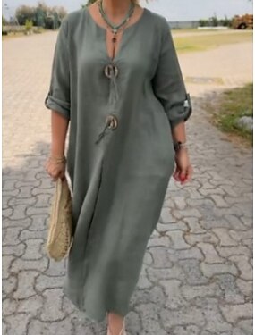 Femmes Robe Midi Faux coton lin Robe Caftan Robe Décontractée ancien Mode Moderne Extérieur Vacances Sortir Coupe régulière Uni Manche Courte Col en V Bleu Marron Vert Gris Été Printemps