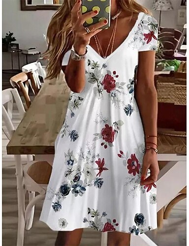 Robe Mini Femme Petite Robe Petite Robe T-Shirt Robe Tee Robe D'été Mode Active Streetwear Vacances Anniversaire Ajustement Régulier Fleurie Manches Courtes Col V Noir