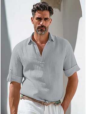 Homme Chemise Chemise en lin Style Viking Chemise popover Chemise d'été Tenue de plage Couleur Unie Vacances Rue Blanche Kaki Gris Manches courtes Col en V Été Printemps Vêtement Tenue
