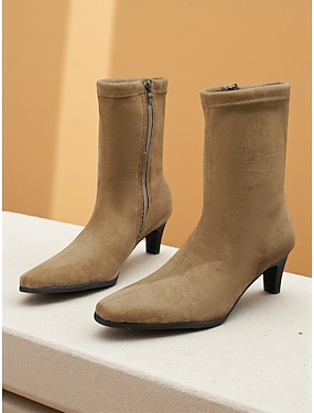Bottes mi-mollet en daim beige pour femme - élégantes bottes extensibles à bout pointu avec fermeture éclair latérale pour un usage quotidien et au bureau