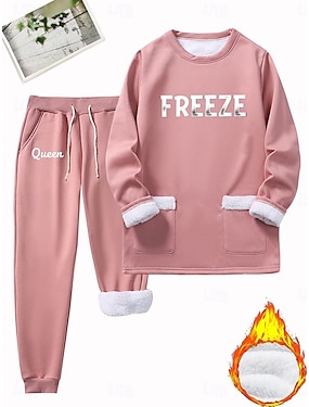 Ensemble de pyjamas pour femmes doublé en polaire élégant chaud mode ensembles de deux pièces survêtements pantalons manches longues col ras du cou impression graphique lettre extérieur vacances