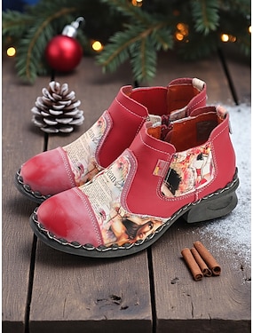 Bottines Chelsea rouges en cuir véritable pour femmes, faites à la main, avec patchwork d'imprimés artistiques, confortables et décontractées de style vintage pour Noël et les tenues d'hiver