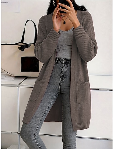 Femmes Pull Cardigan Mode Streetwear Occasionnel Couleur Unie Côtelé Ouvert devant Avec Poches Tricoté manche longue Hauts Longs Tricoter Extérieur Quotidien Week-end Rouge vin Noir Automne Hiver