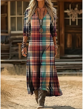 Femmes Robe Maxi Robe Vintage Robe Décontractée ancien Quotidien Extérieur Vacances Coupe régulière Plaid manche longue Col en V Rouge Printemps Automne