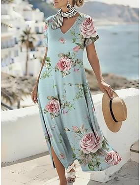 Femmes Robe maxi Robe bohème Robe Décontractée Robe trapèze Robe Imprimée ancien Extérieur Plage Vacances Coupe régulière Fleuri Manche Courte Col en V Bleu Rose Claire Violet Orange Été Printemps