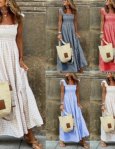 Femmes Robe maxi Robe trapèze Robe Nuisette Vacances Occasionnel Extérieur Sortir Coupe régulière Plaid Sans manches Bretelles spaghetti Noir Rouge Bleu Ciel Beige Été Printemps