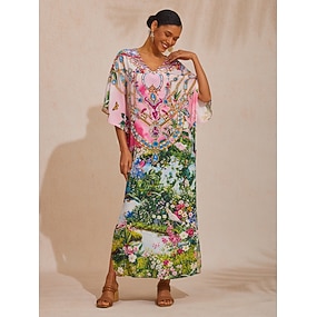 Femme Robe Caftan Robe imprimée Robe mi-longue Robe mi-longue Bleu Manches mi-longues Fleur / Plantes Imprimer Printemps été Col V Plage Plage XS S M
