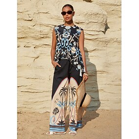 haut de vacances en satin soyeux à motif palmiers, idéal pour les soirées d'été.