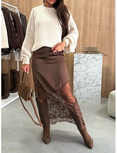 Femmes Jupe de vacances Mode Occasionnel Maxi Taille haute Jupes Uni Dentelle Patchwork Micro-Élastique Quotidien Rue Noir Marron Printemps Polyester