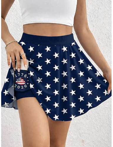 Jupes courtes taille haute style vintage pour femme, imprimé graphique, grande élasticité, rouge kaki, polyester, idéales pour la fête de l'indépendance et le quotidien.