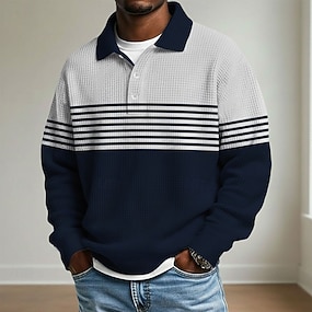Homme Rayé Chemises Polo Gaufre Polo de rugby manche longue Polos Chemises à Col Occasionnel Athleisure Tenue quotidienne Boutons Printemps Automne Hiver Bleu Noir Rouge