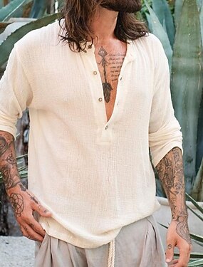 Homme Chemise Chemise en lin Chemise à col officier Chemise popover Chemise d'été Tenue de plage Couleur Unie Vacances Rue Abricot manche longue Été Printemps Vêtement Tenue Boutons