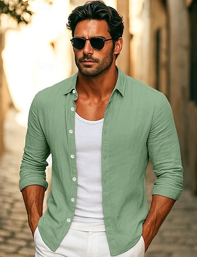 Homme Chemise Chemise en lin Chemise d'été Tenue de plage Uni Vacances Occasionnel Noir Blanche Bleu Vert manche longue Revers Printemps & Été Vêtement Tenue