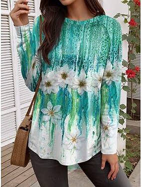 Femmes T-shirt Fleuri Graphique ancien Élégant Occasionnel manche longue Col ras du cou Hauts Réguliers Quotidien Patchwork Imprimé Jaune Rose Claire Bleu Violet Vert Automne Hiver