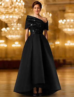 Ligne A Longueur au sol Robe de Soirée Tenue de soirée Élégant ancien Scintillant Manche Courte Une Épaule Formel Mariage Poche Satin Extensible avec Paillettes Châle 2025