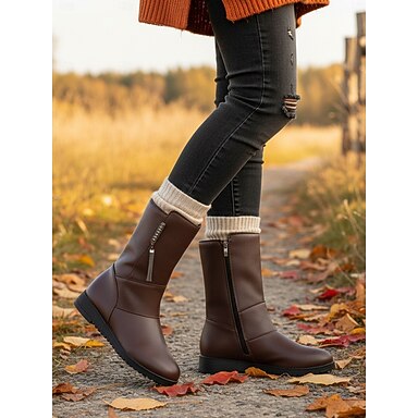 Bottes mi-mollet marron pour femmes avec talons bas et fermeture éclair latérale, chaussures de mode décontractées en cuir confortables pour un usage quotidien, le travail &tenues d'automne et d'hiver