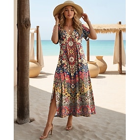 Femmes Robe maxi Robe trapèze Robe d'été Vacances Occasionnel Plage Fête Date Coupe régulière Graphique Géométrique Manche Courte Col en V Jaune clair Rouge Marron clair Orange Été Printemps
