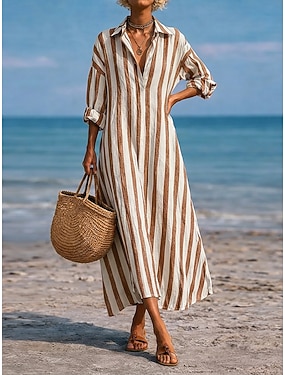 Robe longue maxi pour femme, robe chemise en faux coton et lin, robe décontractée, mode quotidienne moderne, vacances, sorties, coupe ample, rayée, manches longues, col en V, bleu, noir, rose, rouge, printemps, automne