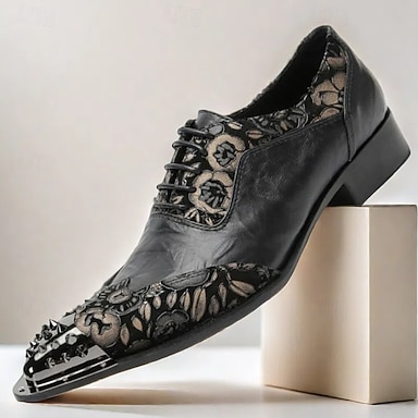 chaussures habillées à lacets en cuir noir pour hommes – cuir de vachette de qualité supérieure avec broderie florale et embout à clous métalliques pour événements et fêtes officiels