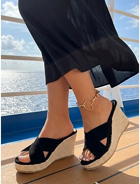 sandales compensées pour femmes – chaussures à enfiler à bout ouvert en daim noir avec plateforme tressée pour l'été, les tenues décontractées et la plage