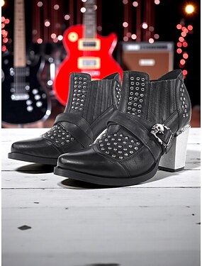 Bottines en similicuir noir pour femme avec bordure cloutée, bride à boucle et coutures western, chaussures de mode urbaine tendance