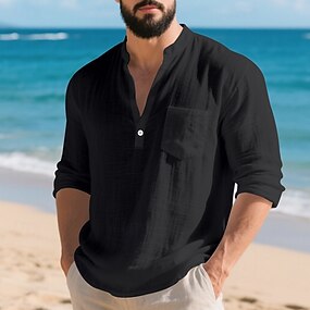 Homme Chemise Chemise en lin Chemise popover Chemise d'été Chemise Décontractée Chemise de Plage Uni Vacances Occasionnel Noir Blanche Kaki Gris foncé manche longue Band Collar Printemps Automne
