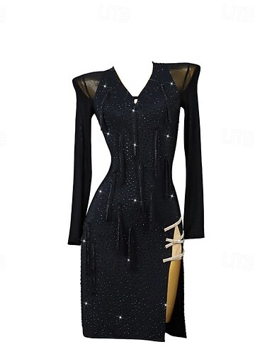 Danse salsa latine Robe Strass Gland Épissage Femmes Performance Soirée manche longue Maille Spandex