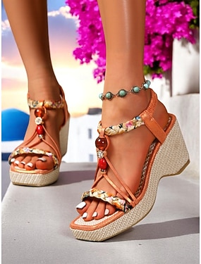 Sandales compensées à brides perlées pour femmes – chaussures d'été bohèmes avec des accents de pierres précieuses pour les tenues de villégiature et les vacances à la mer