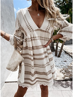 Femme Mini robe Robe casual Robe bohème à manches longues Robe d'été Bohême Vacances Ample Géométrique Bloc de couleur Col V Noir Abricot Eté