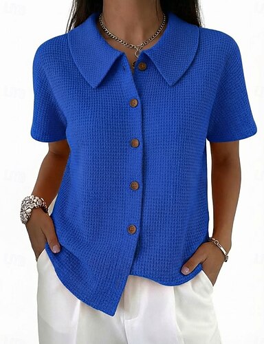 Femmes Chemise gaufrée Boutons Uni ancien Élégant Classique Sans manches Manche Courte Col Rabattu Col de chemise Hauts Réguliers Quotidien Bleu Noir Blanche Rose Claire Orange Été Printemps