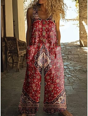 Femmes Combinaison Actif Fleuri Sans manches Jambe large Col rond Patchwork Quotidien Vacances Coupe Ample Bleu Rouge Orange Été