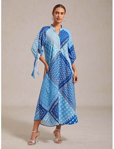 Robe longue à imprimé patchwork floral géométrique pour femme, col montant, manches 3/4, printemps-automne