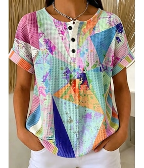 T-shirt en gaufre pour femmes impression graphique géométrique abstraite vintage élégant classique à manches courtes col rond hauts réguliers quotidiens bleu violet vert été printemps