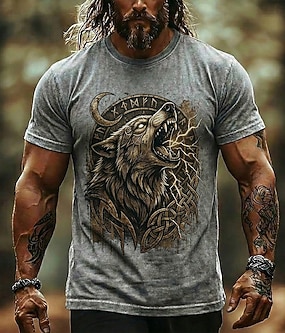 T-shirt homme en coton mélangé lavé, motif loup viking et runes nordiques, nœud celtique, style streetwear, tailles S, M, L, XL, XXL, XXXL