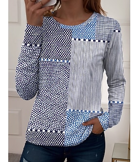 T-shirt Femme Manches Longues Col Ras Du Cou Manches Longues Tunique Rayée Décontracté Hauts Normaux Quotidien Imprimé Bleu Printemps Automne Avant-printemps