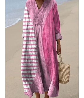 Robe midi femme V en col Longue Manche Kaftan Légère Coupe Ample A Ligne Robe Décontractée Boho Fête Sortie Graphique Géométrique Rayée Longue Manche V en col Cendre Jaune Rose Orange