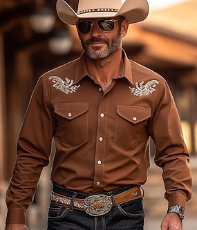 Homme Etoile Chemise Western Chemise de cow-boy manche longue Western Printemps Automne Col Rabattu Boutonner Marron