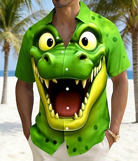 Homme Dessin animé Crocodile Drôle Chemise Chemises hawaïennes Chemise Aloha Manche Courte Hawaïen Vacances Fête Été Col Rabattu Impression 3D Une poche avant Chemise en lin Vert