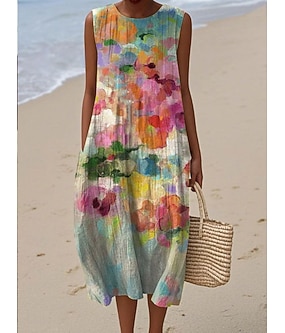Robe Midi Femme En Lin Comme Robe D'Été Robe Tunique Robe A-Line Vacances Décontractée Boho Plage Fête Sortie Coupe Ample Imprimé Floral Sans Manches Col Rond Bleu Gris Rose Beige Été Printemps