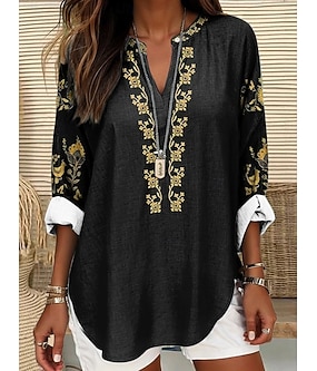 Blouse Femme Lin Similaire Respirant Léger Tunique Col en V Manches Longues Bohême Décontracté Floral Graphique Vintage Tropical Tops Réguliers Quotidien Vêtements de Vacances Imprimé Noir Bleu Kaki