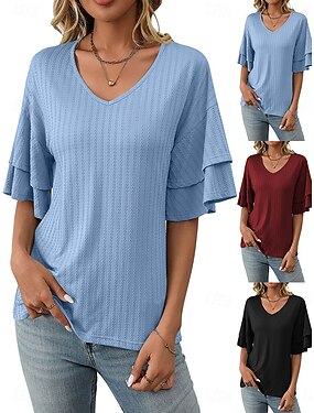 Femmes Chemisier A Volants Patchwork Uni ancien Élégant Occasionnel Manche Courte Col en V Hauts Réguliers Quotidien Fête Sortir Noir Blanche Vert Claire Vin Bleu Ciel Été Printemps