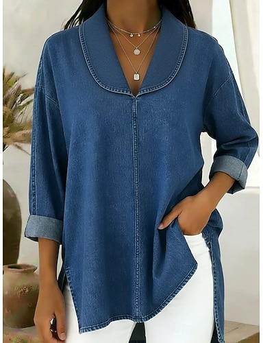 Femmes Chemise popover Chemise Décontractée Chemisier Couleur Unie ancien Occasionnel manche longue Col Rabattu Hauts Réguliers Quotidien Extérieur Fête Bleu Noir Rouge Kaki Printemps Automne Hiver