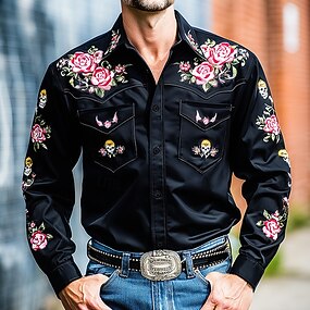 Homme Imprimé Floral Crânes Fleurs Chemise Chemise Western Chemise de cow-boy manche longue Vintage Rétro Occasionnel Extérieur Vêtements de travail Printemps Automne Col Rabattu Deux poches avant