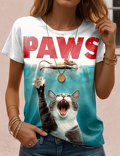 Femmes T-shirt Imprimé Graphique Chat Lettre ancien Élégant Classique Manche Courte Col ras du cou Hauts Réguliers Quotidien Week-end Bleu Violet Vert Kaki Été Printemps