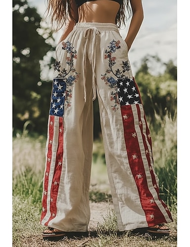 Pantalon palazzo à jambes larges pour femme, style bohème, longueur cheville, taille haute, imprimé floral, cordon de serrage, taille élastique, respirant et confortable, idéal pour la ville et le quotidien. Parfait pour la fête de l'indépendance américai
