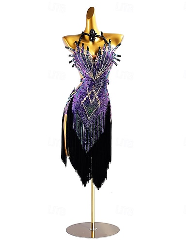Danse Latine Robe Strass Perles Gland Femmes Performance Entraînement Sans manches Spandex