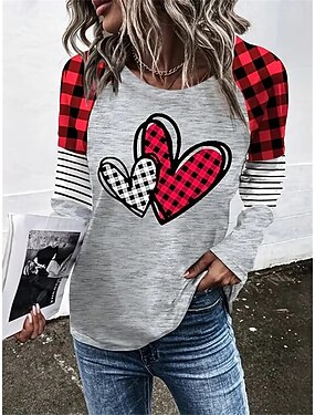T-shirt Valentine pour femmes en forme de cœur décontracté impression manches longues tops longs col ras du cou quotidien jaune rouge bleu printemps et automne