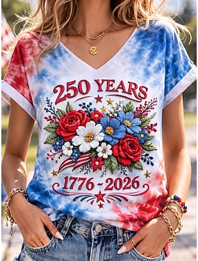 Jour de l'Indépendance Américaine Femmes T-shirt Imprimé A Ombre Fleuri Graphique ancien Élégant Classique Manche Courte Col en V Hauts Réguliers Quotidien Week-end Vêtements de vacances Blanche