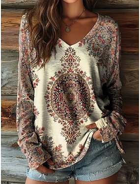 Femmes Chemise Bohème T-shirt Imprimé Graphique Bohème ancien Occasionnel manche longue Col ras du cou Hauts Réguliers Quotidien Week-end Vêtements de vacances Noir Été Printemps Automne